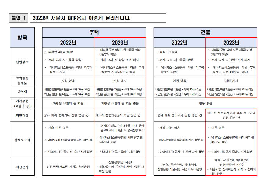 서울시 노후 주택 에너지 효율 개선 지원금 2023 변경 내용